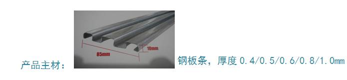 产品配置:采用宝钢镀锌板轧机成0.6*10*85多筋骨面板 10根,以间隔84mm 和6根板做腿+12个立撑 组成。