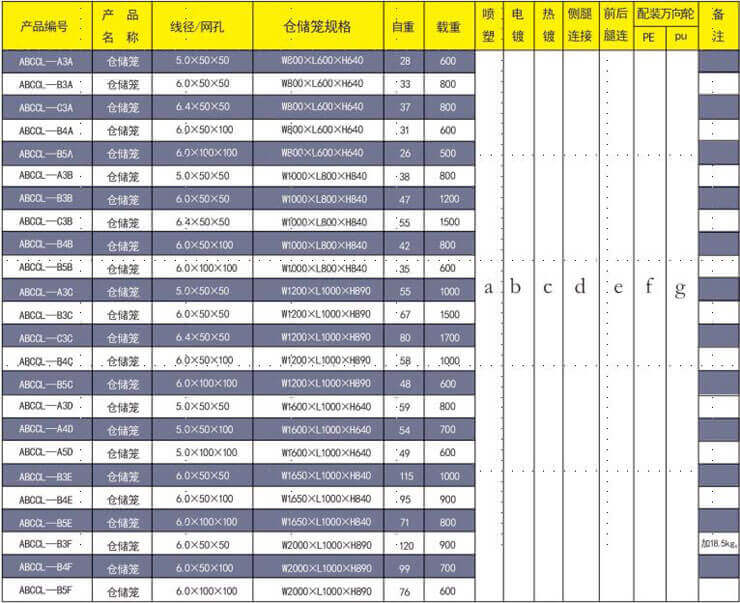 标准ABCCL—B3A型型: ABCCL—(安贝仓储笼) A1A代表线径5mm,B代表代表线径6mm,C代表代表线径6.4mm。 A1A(为网孔25*25mm),2(为网孔25*50mm),3(为网孔50*50mm)4(为网孔50*100mm) 5(为网孔100*100mm)。 A1A代表笼子规格L800*W600*H640,B代表表笼子规格L1000*W800*H840,C代表表笼子规格L1200*W1000*H890