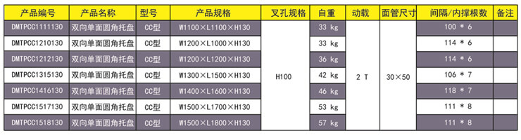 CC型—双向单面圆角钢托盘 产品用途:主要为袋装的软包装大批量物品存储和周转。改变老式四个尖角焊接,采用圆角工艺,主要防止麻袋在放置时不容易刮破。